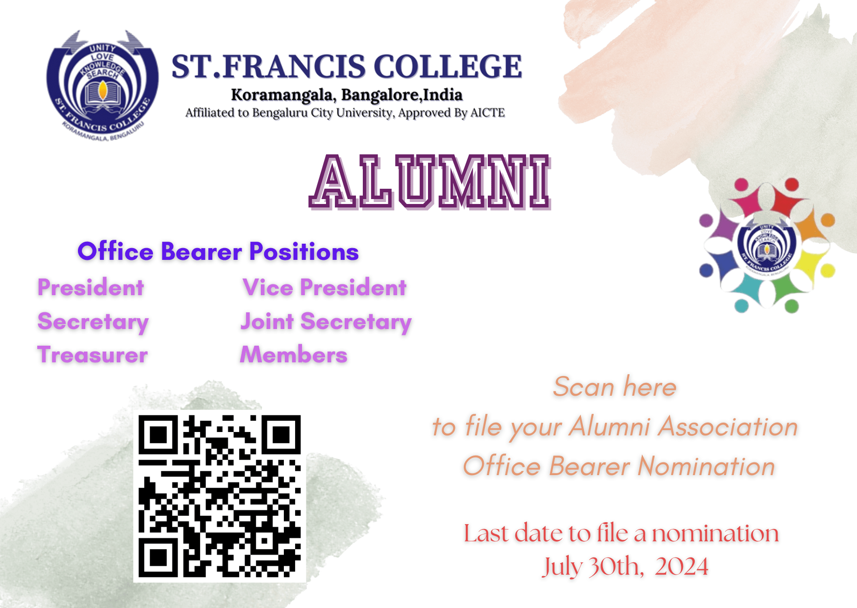 We are excited to announce that nominations for the St. Francis Alumni Association office bearer positions are now open! If you are interested in serving and contributing to our vibrant alumni community, please follow the QR code or the link provided to file your nomination.